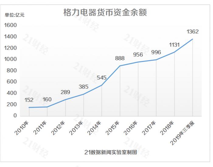 事实上,格力电器并不差钱。据21数据新闻实验室统计,格力电器的货币资金从2010年开始逐年增加,2019年第三季度末已达到1362.33亿元。