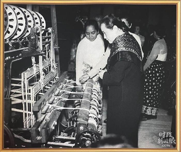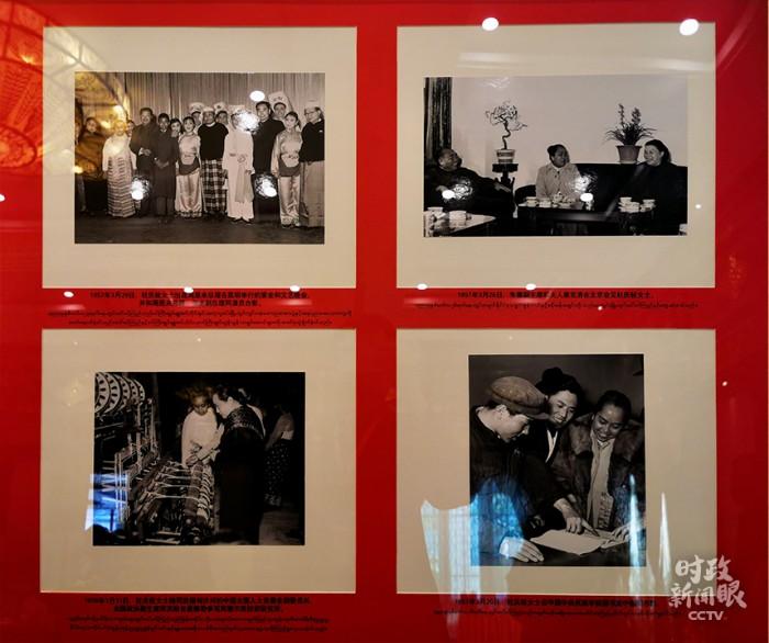 △庆祝中缅建交70周年图片展展出了宋庆龄1956年访问缅甸参观纺织研究所的照片,陪同她的白衣女士就是昂山素季的母亲都庆枝。那一年,昂山素季约11岁。
