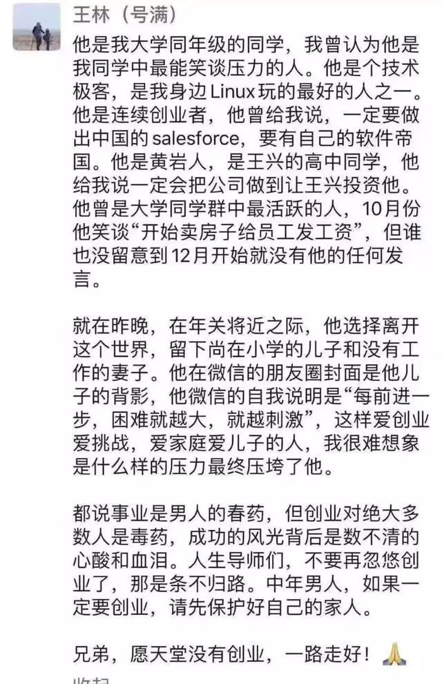 年仅42岁,猝然离世!又一位创业者自杀:被曝曾卖房给员工发工资!