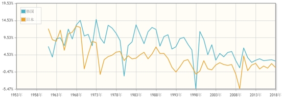 事实真的是这样?世界银行数据显示,日本在奥运会后经济增速逐步下行,而韩国在1988年前经济增速就已经保持20年的高增长。