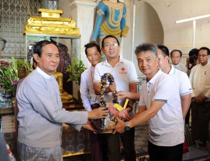 2018年9月,中缅在修复因地震受损的蒲甘佛塔方面的合作正式启动。图为2019年8月3日,缅甸总统温敏(左一)来到蒲甘他冰瑜寺,慰问中方专家及工作组。