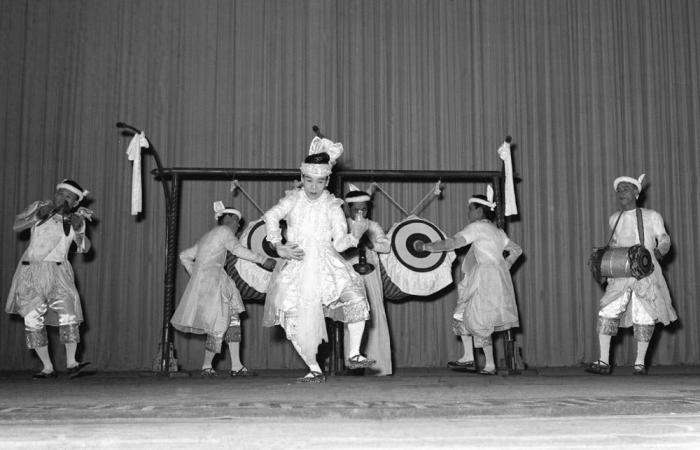 1955年9月28日,缅甸联邦文化代表团在北京首次演出。图为缅甸舞蹈家吴盛昂敏表演皇族打鼓舞。