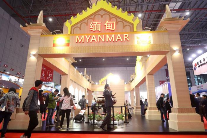 2018年11月5日至10日,首届中国国际进口博览会在上海国家会展中心举行。图为人们在缅甸国家展区内参观。