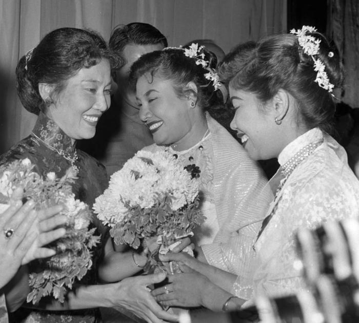 1961年1月6日,中国电影周在仰光总统电影院举行开幕式。图为缅甸电影演员向中国电影演员张瑞芳(左)献花。