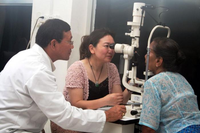 2011年5月31日至6月7日,中国赴缅国际复明医疗队在缅甸仰光开展“光明行”活动,为248名缅甸白内障患者免费进行手术。图为中缅两国医生为已接受手术的缅甸白内障患者复查。