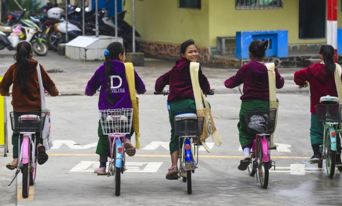 国境线将云南省瑞丽市姐相乡一个村寨一分为二,中方一侧称银井,缅方一侧称芒秀,是典型的“一寨两国”村落。图为银井小学几位缅籍学生骑车回家,跨过银井边防口岸国境线。
