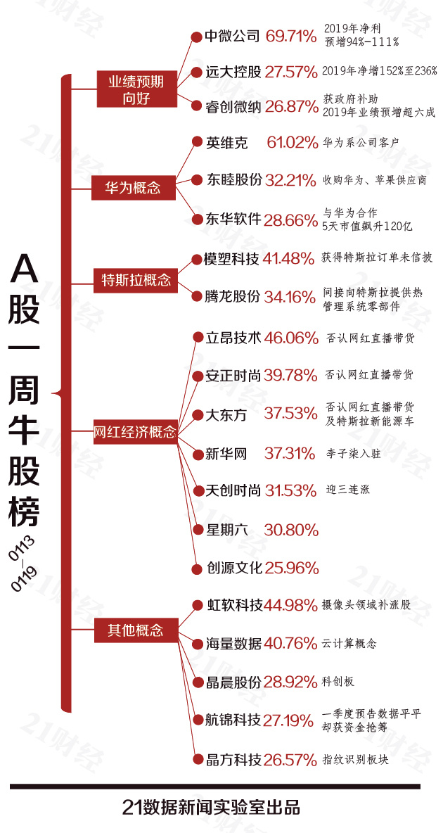 纵观TOP20牛股,网红概念股占了7只。网红概念龙头星期六(002291.SZ)虽然17日尾盘炸板,但全周累计仍有30.80%的涨幅。