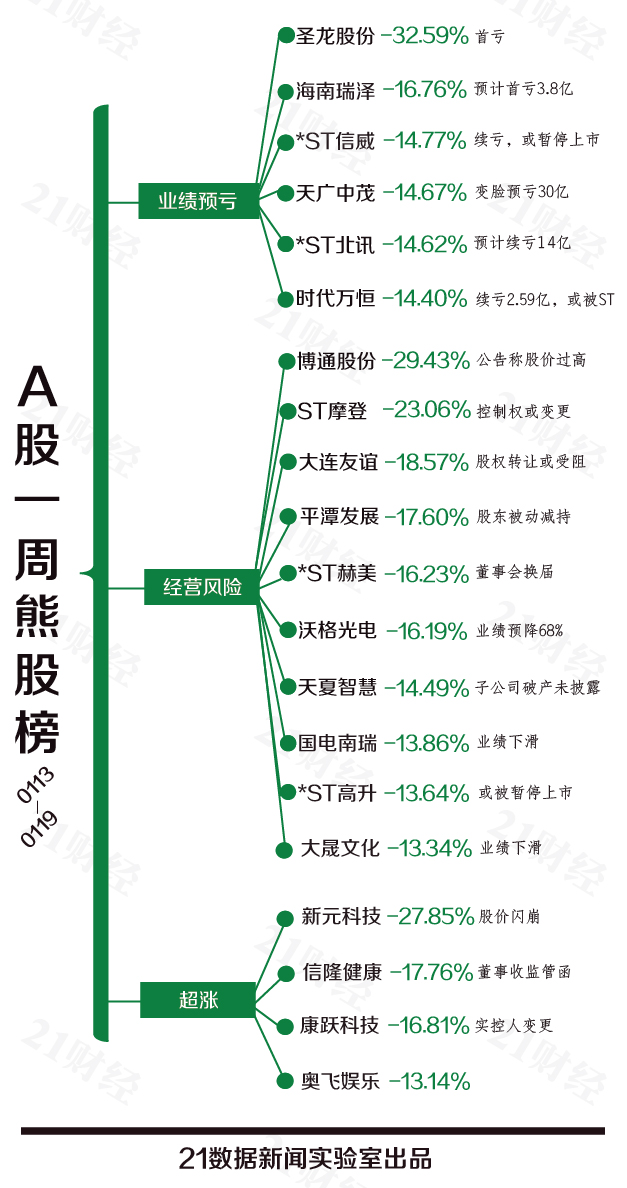 本周熊股榜单中,圣龙股份(603178.SH)、海南瑞泽(002596.SZ)、*ST信威(600485.SH)、天广中茂(002509.SZ)、*ST北讯(002359.SZ)、时代万恒(600241.SH)等相继发布2019年业绩预亏公告。其中,圣龙股份、海南瑞泽由盈转亏;*ST信威前三季度已亏损158亿元,近日公告预计续亏,拉响暂停上市警报,股价7天6跌停,不过此前因公告称拟出资约26亿美元参与发起设立5G基金,推升股价在23天收出22个涨停板。