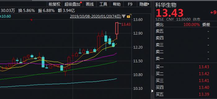截至1月20日午间收盘,科华生物封住涨停,硕世生物、达安基金等也有不同程度的上涨。