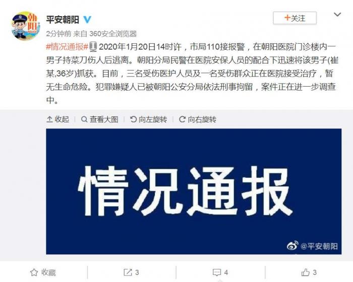 2020年1月20日14时许,市局110接报警,在朝阳医院门诊楼内一男子持菜刀伤人后逃离。朝阳分局民警在医院安保人员的配合下迅速将该男子(崔某,36岁)抓获。目前,三名受伤医护人员及一名受伤群众正在医院接受治疗,暂无生命危险。犯罪嫌疑人已被朝阳公安分局依法刑事拘留,案件正在进一步调查中。