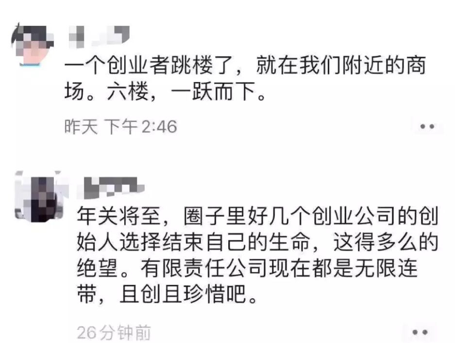 这并非个例,有人透露,“年关将至,圈子里好几个创业公司的创始人选择结束自己的生命,这得多么的绝望。”