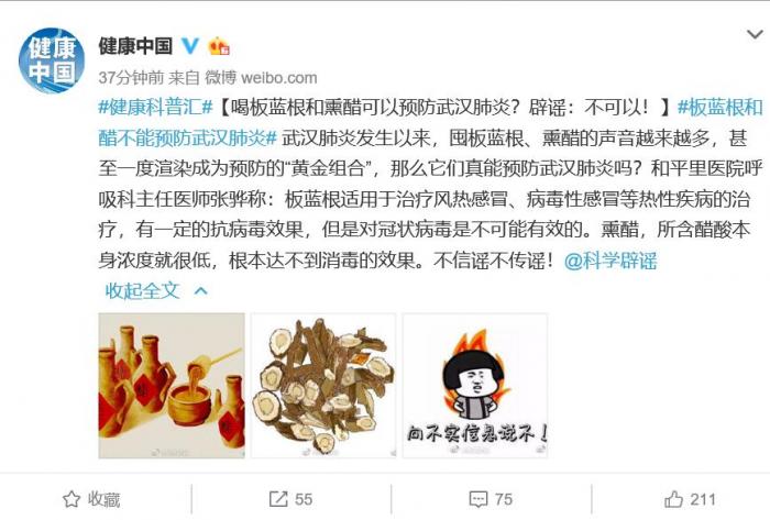 1月21日晚国家卫健委官方微博“健康中国”消息,武汉肺炎发生以来,囤板蓝根、熏醋的声音越来越多,甚至一度渲染成为预防的“黄金组合”,那么它们真能预防武汉肺炎吗?