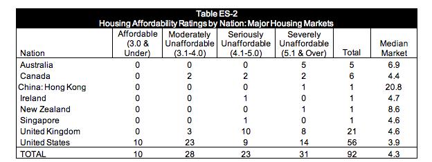 调查以一个城市的楼价中位数除以家庭全年收入中位数计算,比率愈大则负担能力愈差。楼价与家庭收入中位数比率在5.1倍及以上,便属于“严重负担不起”,此次调查发现有31个城市处于这一水平。全球房价最难负担城市排行榜的第二及第三位分别为温哥华及澳洲悉尼,楼价与家庭收入中位数比率分别为11.9倍及11倍。
