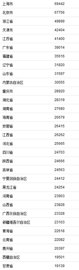 浙江(49899元)、天津(42404元)、江苏(41400元)属于第二梯队,其人均可支配收入超过4万元。