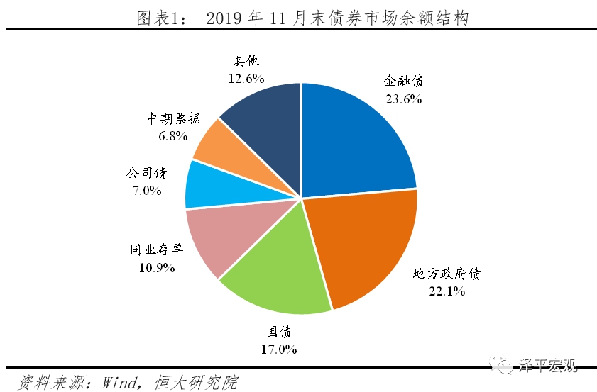 截至2019年11月,中央政府债务余额16.28万亿,地方政府债务余额21.33万亿,合计37.6万亿。其中债券形式合计37.4万亿元,占债券市场比重39.1%。此外,与政府关系紧密的城投债余额7.8万亿元。从中央政府看,2019年11月末,国债余额为16.22万亿,1-11月净融资额约1.44万亿,债券市场余额为95.7万亿,国债余额占比17.0%。从地方政府看,2019年1-11月全国发行地方政府债券4.32万亿,其中一般债券1.77万亿,专项债券2.55万亿,11月末全国地方债务余额21.11万亿,占中国债券市场余额比重为22.1%。