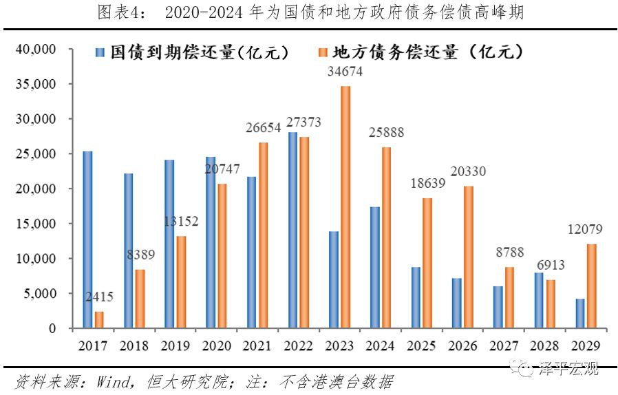 2019年11月底,中央政府债务余额16.28万亿元,地方政府债务余额21.33万亿元,合计37.6万亿。此外,与政府关系紧密的城投债余额7.8万亿元。中国政府部门杠杆率在国际上处于中等水平。国债和地方政府债务偿还期均集中在2020-2024年的五年,年均到期分别2.1和2.7万亿元,清偿过于集中增加资金周转压力。截至2019年11月末,存量国债、地方政府债券的平均剩余期限分别是7.49和5.0年。IMF测算中国2018年末地方政府隐性债务规模达30.9万亿,增速显著放缓,但规模庞大。