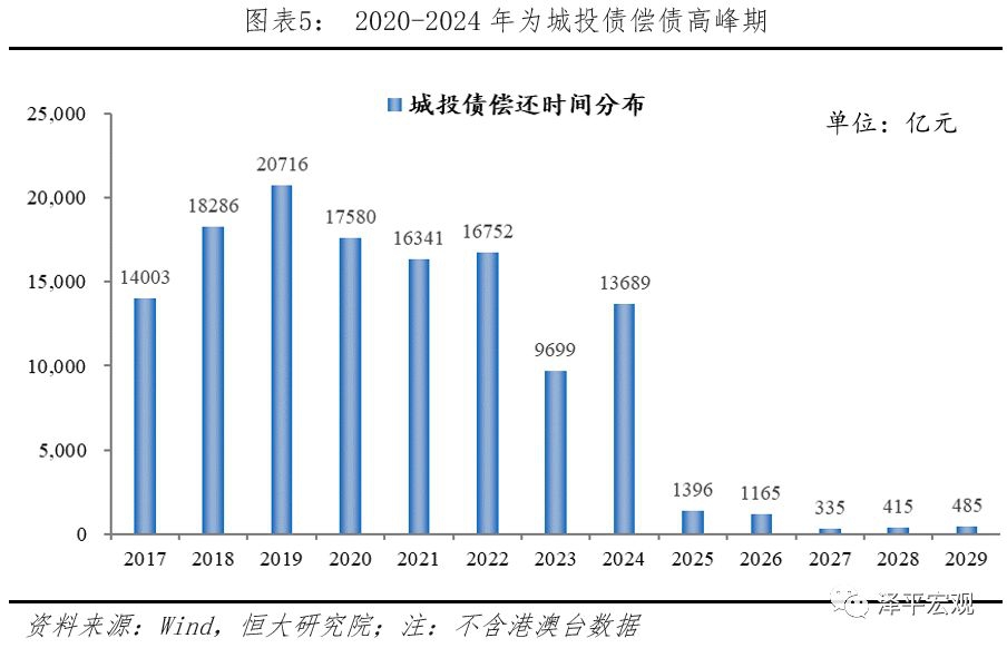 国债和地方政府债务偿还期限集中在2020-2024年的五年,年均到期为2.1和2.7万亿元。截至2019年11月末,存量国债平均票面利率3.52%,平均剩余期限7.49年,集中偿还期在2020-2024年,到期金额为2.45、2.17、2.81、1.39、1.74万亿。截至2019年11月,地方政府债券剩余平均年限5.0年,其中一般债券5.0年,专项债券5.1年;平均利率3.54%,其中一般债券3.54%,专项债券3.53%。地方政府债将集中在2020年至2024年清偿,到期金额分别为2.08、2.67、2.74、3.47和2.59万亿,地方政府需要发行新的债务以延续,清偿过于集中将给地方政府增加债务周转压力。从城投债看,未来偿债高峰期同样集中在2020-2024年,到期金额分别为1.76、1.6、1.7、0.97和1.4万亿元。