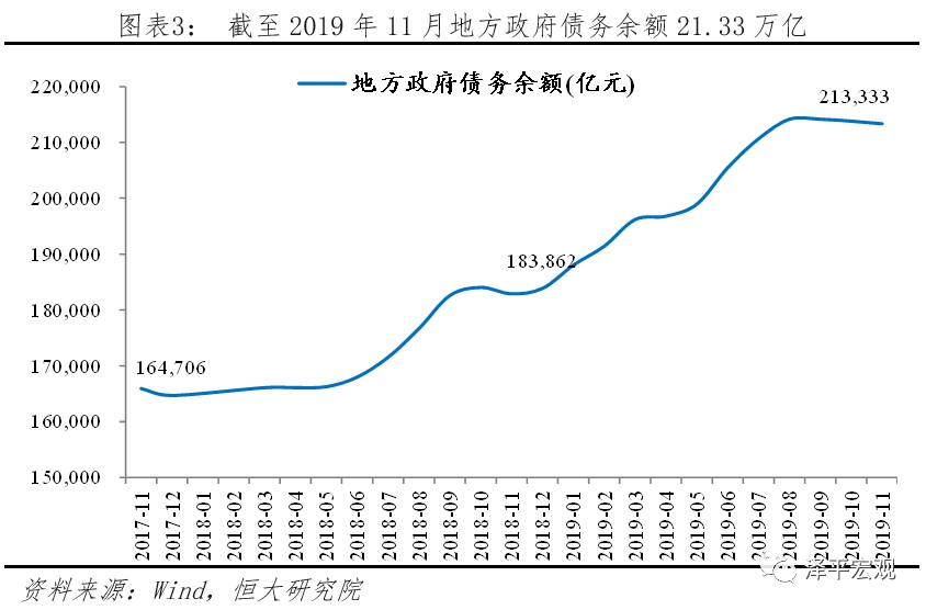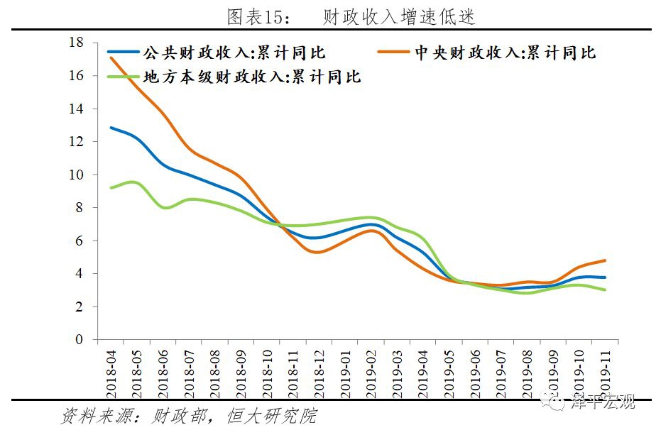 一是城镇化进程以及基础设施建设的巨额资金需求推动债务规模扩张和土地财政。二是地方政府的财力与支出责任不匹配,即使有转移支付,地方政府仍承担大量中央和地方共同支出责任。2018年中央政府通过转移支付和税收返还给地方后,地方政府收入(本级公共财政+转移支付)占全国财政收入比为91.4%,但地方政府收入与支出比仍为89%,还有11%的支出依赖举债。三是预算软约束和GDP导向的政绩考核体系助长了地方政府的举债冲动。四是近年来我国经济增速放缓,且实施减税降费力度较大,财政收入增速连续四年低于名义GDP增速,而改革、发展和稳定及社保和利息支出的压力较大,地方财政捉襟见肘,偿债能力下降,风险上升。2015-2018年财政收入增速分别为5.8%、4.5%、7.4%和6.2%,低于GDP名义增速的7%、7.9%、10.9%和9.7%;2019年全国公共财政收入增长持续放缓,1-11月累计同比为3.8%,远低于名义GDP增速。