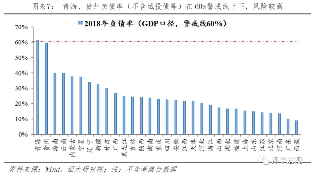 分省市看,贵州、青海、海南等省市债务风险相对较高。负债规模方面,2018年末债务余额规模前五的地区为江苏、山东、浙江、广东和四川,分别为13286、11437、10794、10008和9299亿元,占地方政府债务总额的7.2%、6.2%、5.8%、5.4%和5.0%。负债率方面,以债务余额/GDP衡量,青海的政府负债率高达61.5%,较2017年上升3.5个百分点;第二位是贵州(59.7%),较2017年下降3.9个百分点;其后是海南(40.2%)、云南(39.9%)、内蒙(37.9%)和宁夏(37.5%)。除青海以外,其余各省的政府债务仍在安全线60%以内,如广东(10.3%)、上海(14.3%)、江苏(15%)相对较低。债务率方面,以债务余额/综合财力衡量,综合财力=公共财政收入+中央转移支付和税收返还+政府性基金收入,有6个省市突破国际警戒线100%,分别是贵州(149.7%)、辽宁(144.6%)、内蒙古(130.3%)、云南(109.9%)、天津(106.8%)和湖南(101.7%),青海、海南债务率接近100%,分别为99.9%和99.6%,该部分地区缺乏新的经济增长点,转型缓慢,财政能力不足,风险较高。