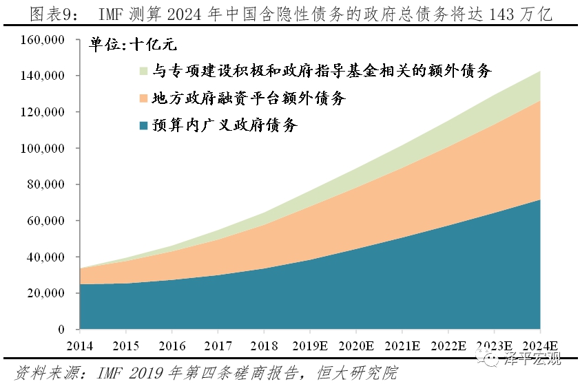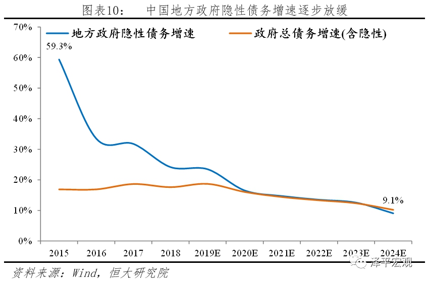 地方政府隐性债务规模较大,IMF预测2024年中国政府总债务达143万亿。从存量债务看,据IMF 2019年第四条磋商报告测算,2018年末含地方政府隐性债务的中国政府总债务为64.5万亿,其中官方广义政府债务为33.64万亿,有可能被确认为地方政府融资平台额外债务为24.11万亿,与专项建设基金和政府指导基金相关的额外债务为6.77万亿,即地方政府隐性债务合计30.9万亿,其规模与政府显性债务相当,由此测算的2018年含地方政府隐性债务的中国政府部门总杠杆率达71.6%。从增速看,2015年地方政府隐性债务增速高达59.3%,2016-2017年降至33.5%和31.8%。在严控地方债务增量、终身追责等政策影响下,2018年隐性债务增速下滑至24.2%。据IMF预测,2024年地方政府隐性债务增速将下滑9.1%,含隐性债务的政府总债务增速降至10.2%,2024年中央和地方政府总债务合计将达142.7万亿。