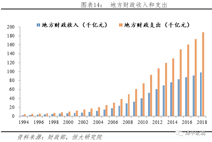 地方政府支出压力大而可用财力不足,因而倾向于通过举债投资发展地方经济。1994-2018年,地方财政收入占比在50%左右,但地方财政支出占比从67.4%上升至85.2%。地方政府财政收支差额不断扩大,从1727亿上升至9万亿,转移规模逐步扩大。