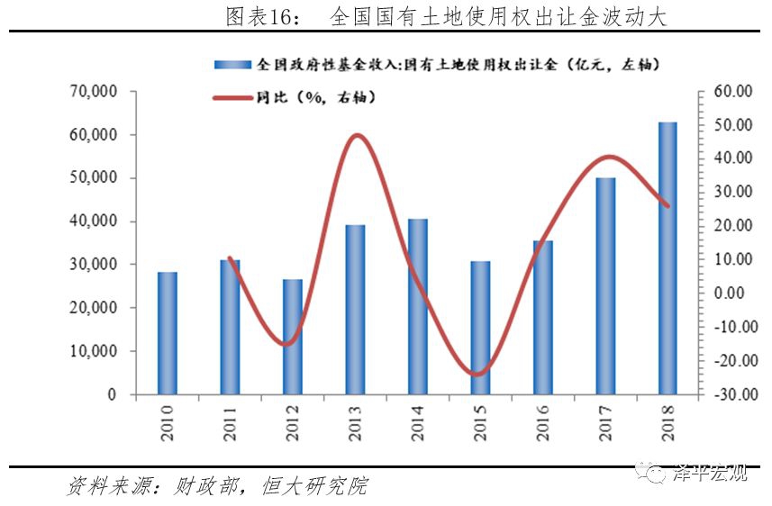 土地出让收入是除公共财政收入之外地方政府的主要收入来源,但受房地产市场调控的影响较大,具有不稳定性、不可持续性,与房地产风险捆绑。2010年-2018年全国国有土地出让收入波动幅度较大,2013年地方土地使用权出让金为4.13万亿元,增幅达44.6%,2014-2018年同比为3.2%、-21.4%、15.1%、40.7%和25%。