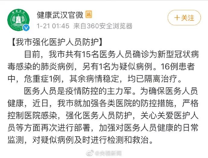 最新消息显示,上海确诊新型冠状病毒感染的肺炎病例2例,武汉新增死亡1例,武汉15名医务人员确诊,山东青岛发现1例疑似病例,广西北海发现1例疑似病例。