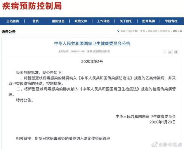 1月21日,据新华社官方微信发布消息称,国家卫健委发布1号公告,将新型冠状病毒感染的肺炎纳入《中华人民共和国传染病防治法》规定的乙类传染病,并采取甲类传染病的预防、控制措施。将新型冠状病毒感染的肺炎纳入《中华人民共和国国境卫生检疫法》规定的检疫传染病管理。