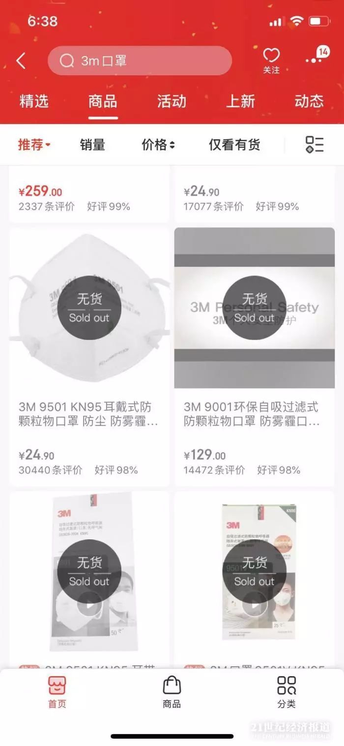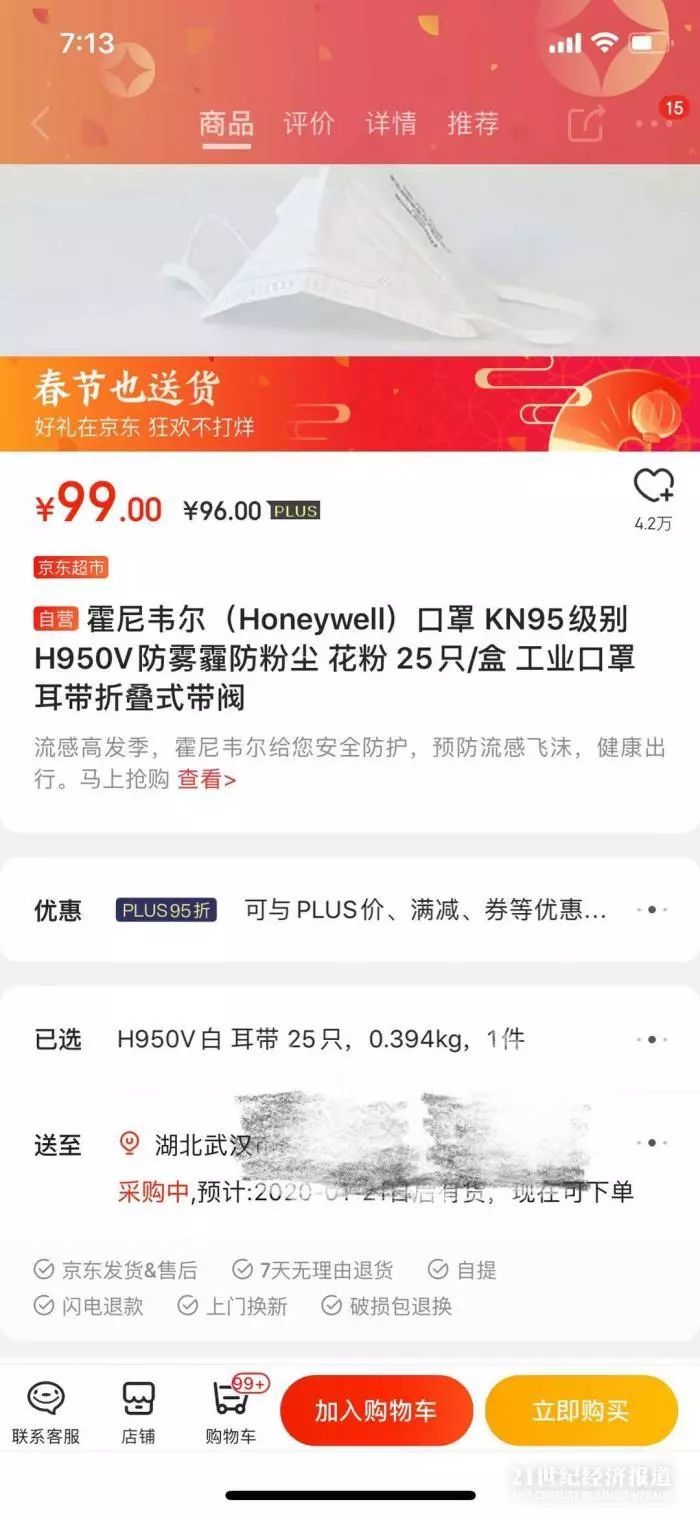 记者查询京东电商平台的多个专业防护口罩品牌旗舰店,部分售罄,部分显示“正在采购中”,预计武汉地区1月21日后有货,不少非京东自营的品牌店铺显示2月1日后方可配送。