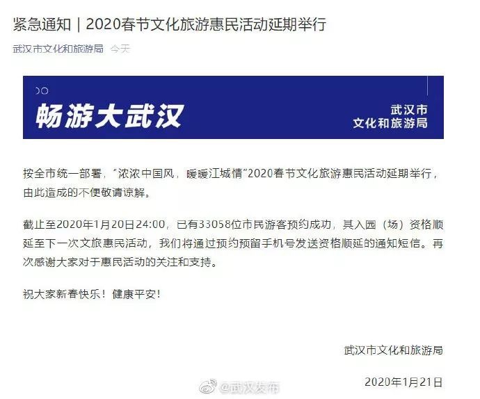 1月21日,武汉文化旅游局对外公布,对2020年春节文旅惠民活动延期,所有已预约游客资格同步延期。