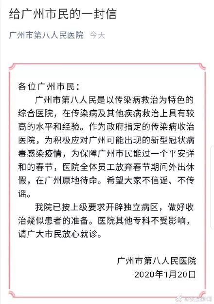 1月20日,广州市第八人民医院发布通知称,“全院职工取消外出休假,并在广州原地待命”。为准备接收新型冠状病毒疑似患者,全体职工取消外出休假。