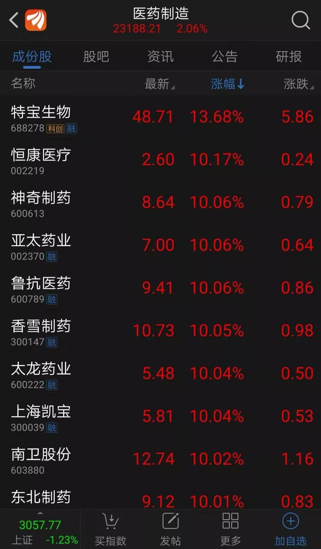 而从整个医药板块看,总市值超45000亿的医药生物指数更是出现大涨行情,指数快速上冲超2%。截至上午11点,指数报收8585.49,成交额超500多亿。 板块内有超240多家个股上涨,超17只股涨停,鲁抗医药、莱茵生物、达安基因、科华生物等医药股连续两日均录得涨停。
