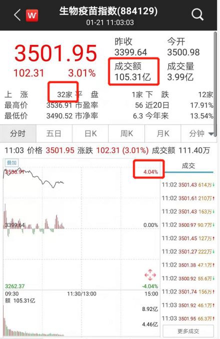 以生物疫苗指数为例,当天指数开盘高开高走,指数涨幅迅速冲击4%以上,超30多家板块个股大涨,短短半日,就有超100亿资金涌入生物疫苗板块。