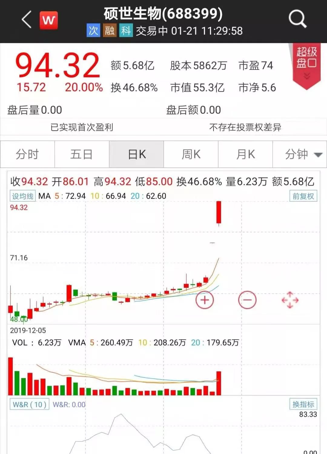 科创板股票硕世生物涨幅最猛,昨天涨停(20%)后,今天午盘又涨停(20%),两天合计涨幅达到了44%。