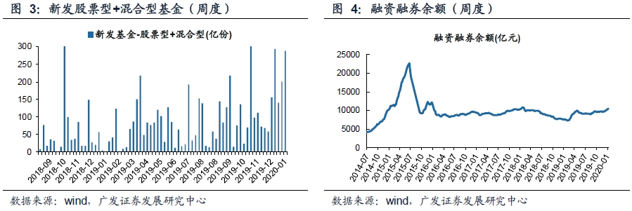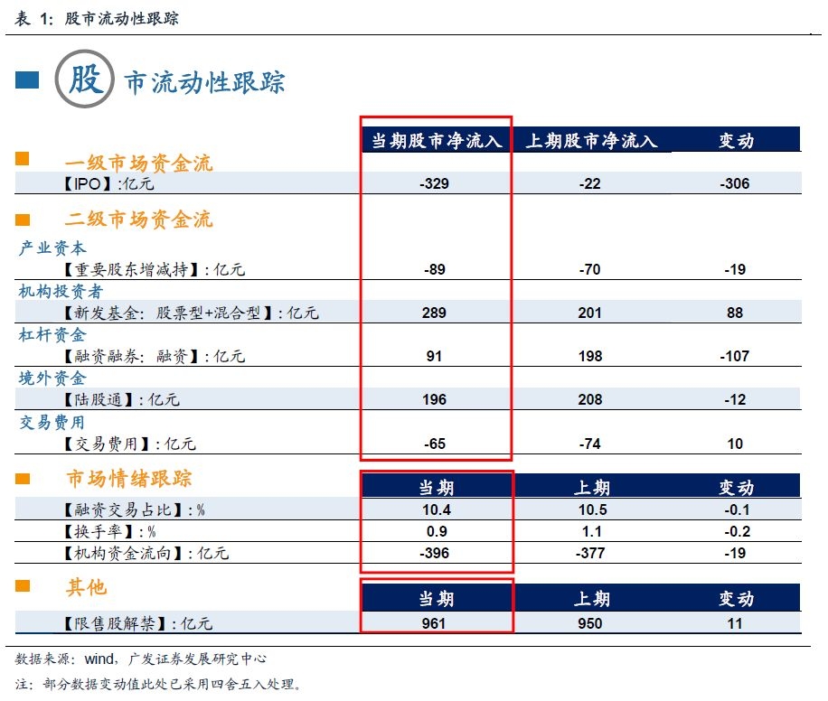 二级市场:上周在新发基金扩张、北上资金流入及两融融资上升带动下,A股二级市场整体呈现净流入。流入方面,上周国内基金(股票型+混合型)新发行289亿元,北上资金净流入196亿元,两融融资增加91亿元;资金流出方面,重要股东减持89亿元,交易费用65亿元。