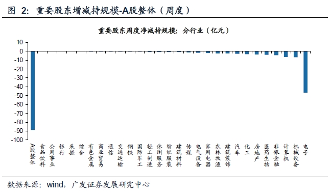 (2)重要股东增减持(A股整体):上周重要股东净减持约89亿元,前一周净减持约70亿元。其中食品饮料、公用事业、银行等为净增持行业;减持规模前三为电子、机械设备、计算机。