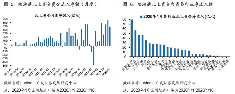 (5)陆港通北上资金流入净额:上周陆股通北上资金净流入196亿元,前一周净流入208亿元。2020年1月(截至1月18日)北上资金净流入539亿元,净流入前五名行业是医药生物、家电、计算机、食品饮料、银行,净流出行业为交运、采掘、建材。