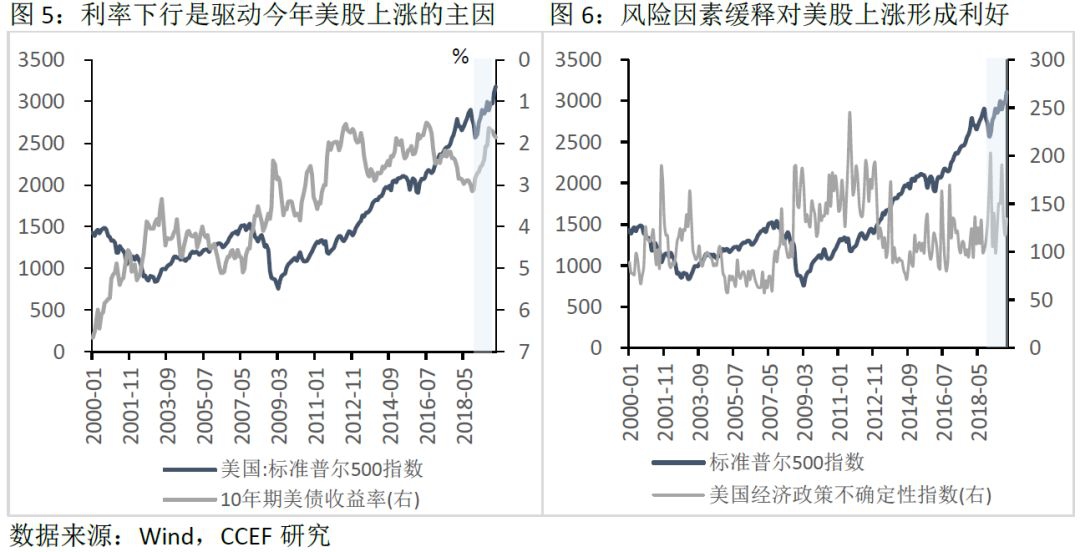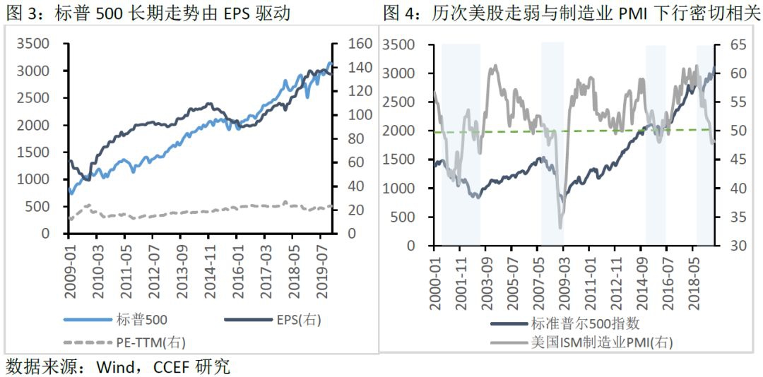 从中长期来看,美股估值相对稳定,股价变动主要由盈利水平所驱动。从历史数据来看,经济放缓、企业盈利水平下行通常会给股票价格带来下行风险。但2019年美股在企业盈利走弱以及制造业PMI持续走低跌破荣枯线的情况下,反而出现大幅上涨,主要受短期内无风险利率下行及风险溢价走低的影响(历史数据显示,10年期美债收益率的走低并不完全对应于美股上涨,主要由于降息操作反映对未来经济的悲观预期,企业盈利在该时期往往表现不佳。而本轮美联储实施的是“预防式”降息,在经济温和增长的情况下表现为无风险利率的快速下行),同时,流动性宽裕是估值上行的重要因素之一。此外,由于年初以来中美贸易摩擦风险有所缓释投资者风险偏好的上升压力,这些都是2019年美股上涨的推动因素。