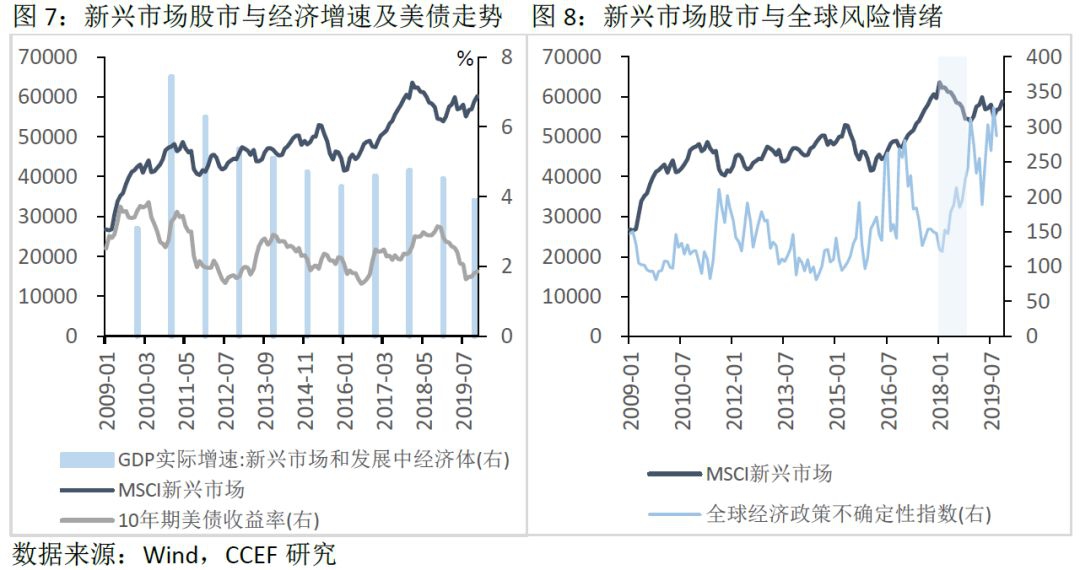 新兴经济体的股市同样取决于其经济基本面、无风险利率以及风险溢价。2016及2017年新兴市场整体复苏,带动MSCI新兴市场指数当年分别上涨6.6%、25.9%。2018年以来,全球贸易摩擦的升级和英国脱欧等问题导致全球经济政策不确定性指数快速攀升,投资者对未来的信心不足,加上GDP增速放缓,是导致新兴市场股市下跌的主要原因。2019年新兴市场股市行情变化和中美贸易前景的不确定性密切相关。