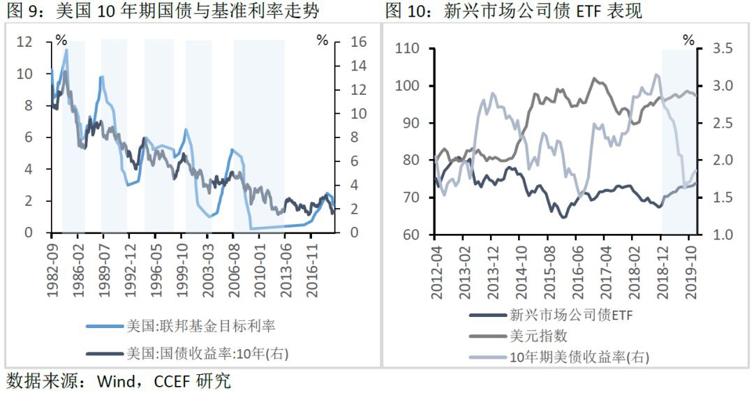 从历史数据来看,美国10年期国债收益率的走势与降息的节奏基本一致,但会有领先效应。目前市场已经消化美国降息三次的效果,10年期美债收益率自9月份之后开始小幅回升,缓解了此前收益率曲线倒挂的情况。美联储12月的FOMC会议声明称,未来一段时间内美联储将维持当前的利率水平,加息需要通胀持续高于2%以上。2020年,美国经济增速存在进一步放缓的风险,通胀中枢有望上行,美债的长期收益率可能会在历史低位呈现出震荡上行的格局。