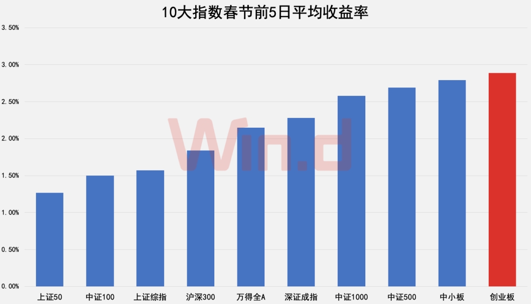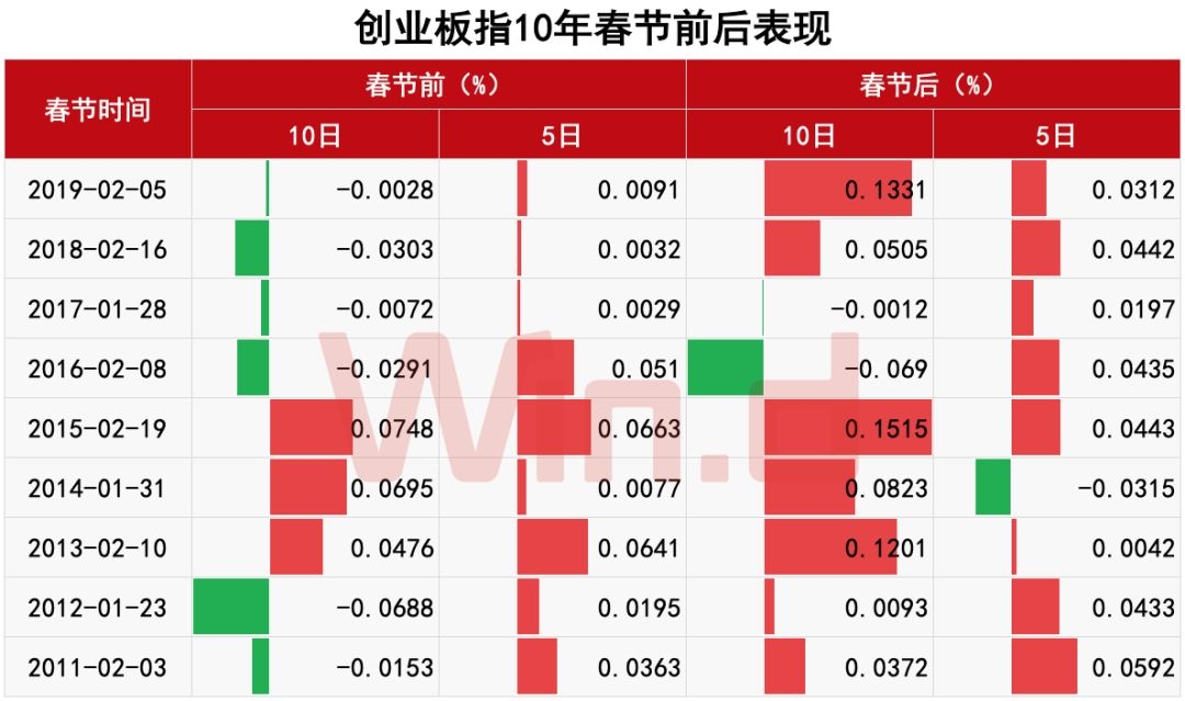 创业板指节后平均涨幅大于节前,且在春节前5个交易日和春节后10个交易日内上涨概率超过80%。