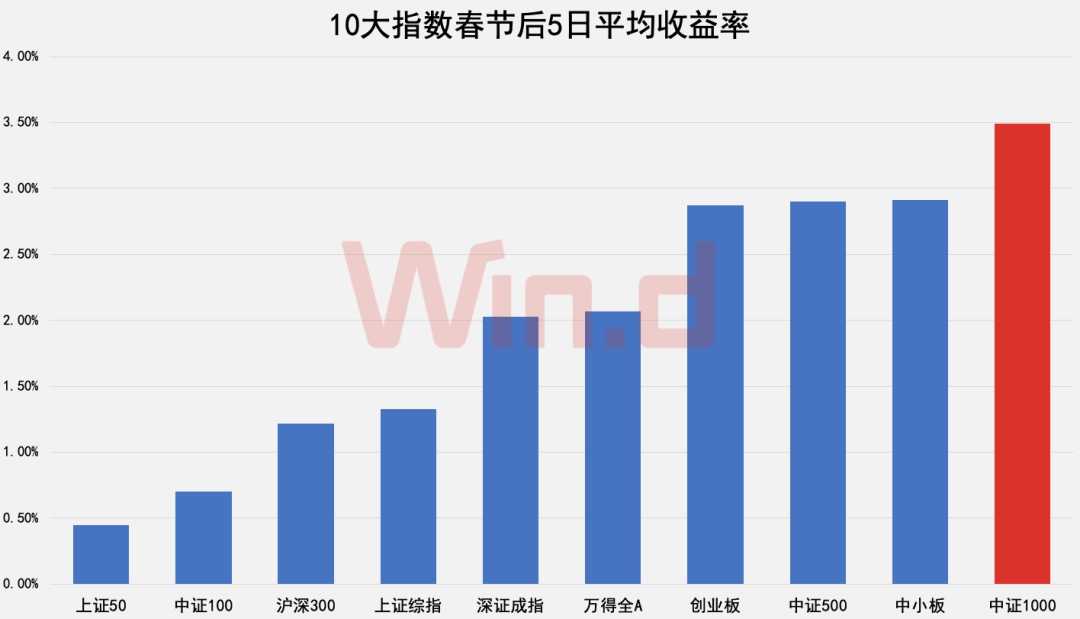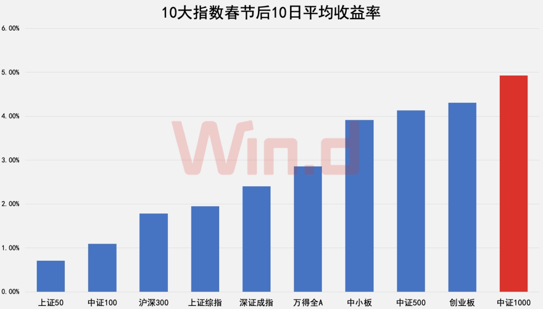 节前5日风格分化相对显著,小盘指数表现要好于大盘指数的表现。从各年平均情况来看,各指数在春节前5日都取得了正收益,其中表现最好分别是创业板指、中小板指、中证500、中证1000,均高于2.5%,而上证50、中证100等大盘指数的平均涨幅均低于1.5%。