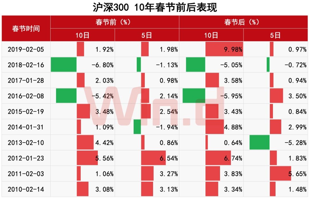 从2010年至2019年,沪深300指数在春节前后各时间段内的平均涨幅均超过1%。