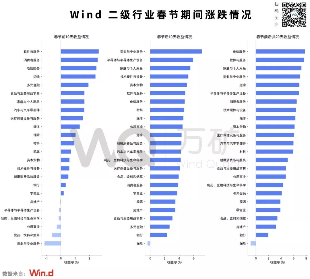 1、有的行业节前表现不佳,节后却出现大逆转:如商业与专业服务业、半导体与半导体生产设备行业、公共事业、食品饮料和烟草等行业;