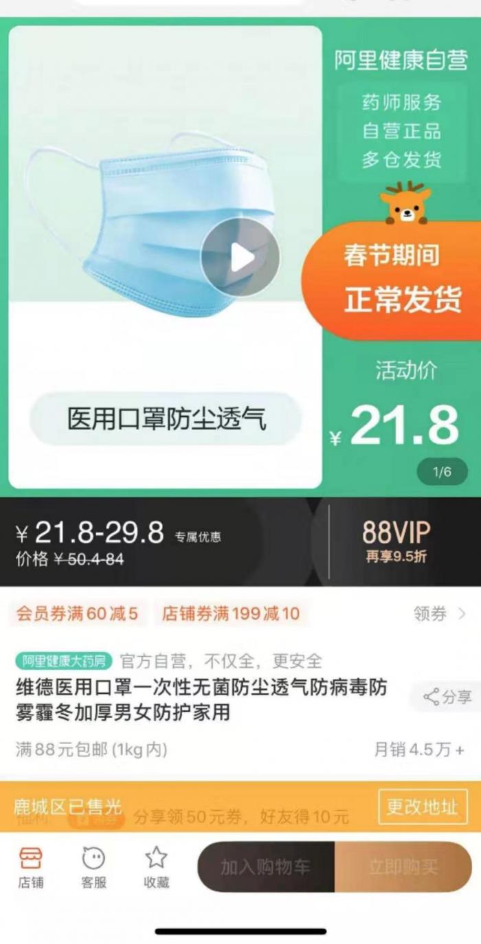 淘宝也在其微博发表声明称,已向淘宝天猫平台上所有销售口罩的商家发出通知,绝不允许涨价销售。随后,饿了么也发布声明,坚决反对医用口罩等防护用品在这个关口涨价,并已按市场指导价对商户定价进行持续筛查,主动干预。