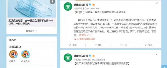 近日,有几条疑似新型冠状病毒肺炎感染患者逃跑的消息传出。来源于豆瓣等网站所谓“上海瑞金医院逃跑的肺炎患者为武汉市卫健委领导干部刘庆香”。1月22日,武汉市卫健委官微称,网传关于武汉市卫生健康委副主任刘庆香同志相关信息严重不实。刘庆香副主任今年55岁,自去年12月底以来,一直坚守在武汉市新型冠状病毒感染的肺炎防控一线;她没有女儿,只有一子在汉工作;她和爱人都不是医生,爱人因患癌症医治无效已于去年在汉去世。网上消息为不实谣言,请广大网友不信谣、不传谣。