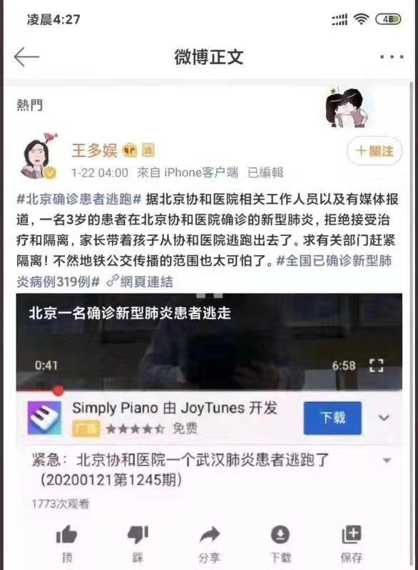1月22日凌晨,网上流传“北京协和医院一确诊武汉肺炎患者跑了”的消息称,一名3岁的患者在北京协和医院确诊为新型冠状病毒感染的肺炎,拒绝接受治疗和隔离,家长带着孩子从协和医院逃跑出去了。