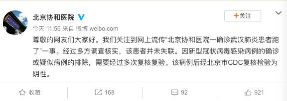 1月22日上午,21世纪经济报道记者就此向北京协和医院求证,相关负责人表示没有听说;中午,北京协和医院官方发布消息称,经过多方调查核实,该患者并未失联。新型冠状病毒感染病例的确诊或疑似病例的排除,需要经过多次复核复验。该病例后经北京市CDC复核检验为阴性。