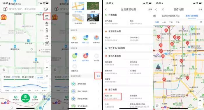 针对新型肺炎,百度地图还依据卫健委官方数据,已紧急上线“发热门诊地图”,用户可直接点击进入查看附近所有发热门诊的医疗机构,或者直接搜索医疗机构,在POI详情页中查看到设有24小时发热门诊的医院。首批已上线北京、上海、武汉、成都四个城市的数据。