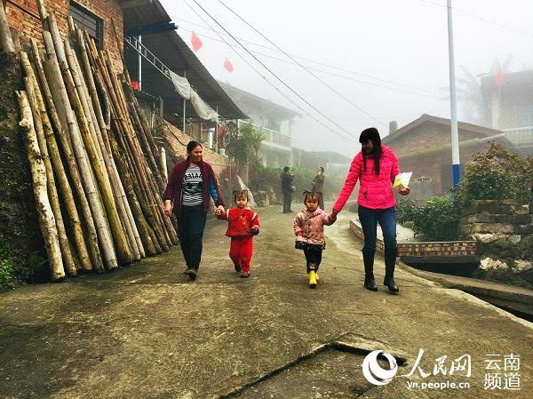 寨子里,一对母女领着一对双胞胎走过。人民网 程浩 摄
